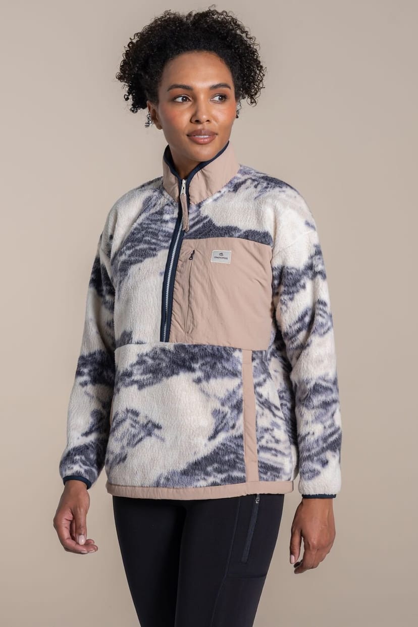 Insulating borg fleece top from Craghoppers. This relaxed half-zip top features a mountain print with contrasting woven trim and a patched-on zipped chest pocket. Ideal for cooler days.