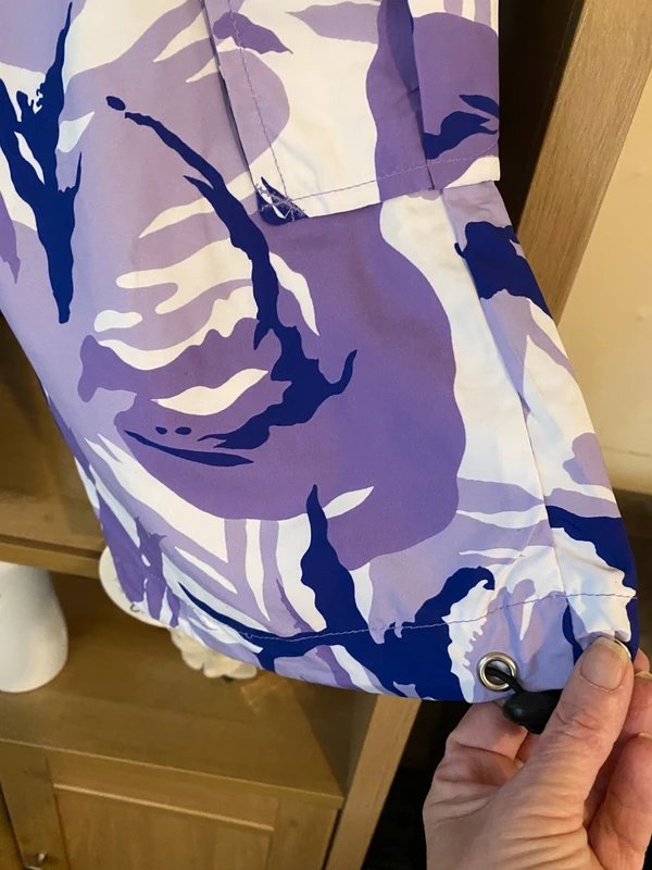 Authentic Deadstock Criminal Damage 3/4 length cargo shorts in a rare purple/lilac camouflage print. These below-the-knee 'shuttle' style shorts with a super wide-leg fit perfectly capture that iconic Y2K rave/skater aesthetic. Crafted from lightweight polyester, they offer a comfortable and stylish choice for any casual occasion.