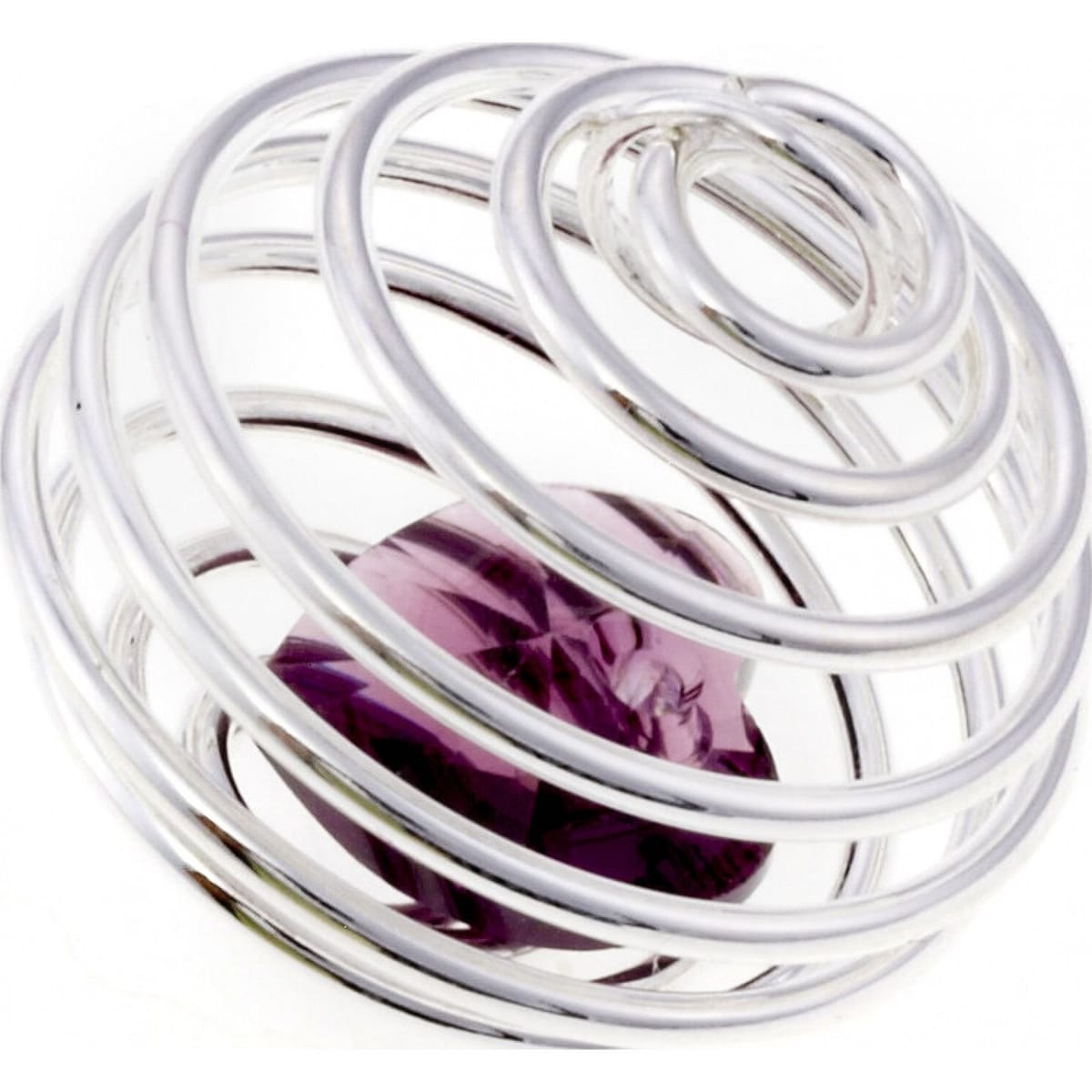 Elegant Cristian Lay charm featuring a spiral design with a purple crystal centerpiece. Crafted from high-quality silver, this piece combines modern aesthetics with sophisticated design. Ideal for adding a touch of glamour to any outfit.
