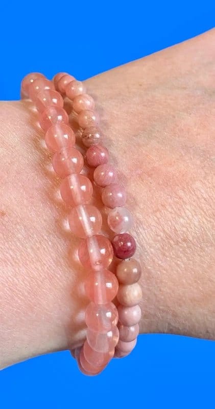 Beautiful crystal bracelets featuring rose quartz and strawberry quartz beads. Perfect for adding a touch of elegance to any outfit.