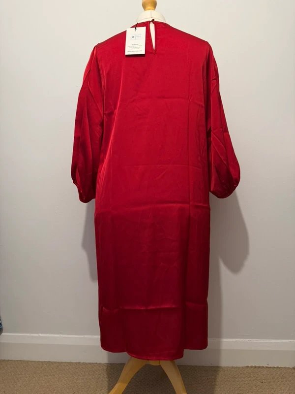 Stunning satin-finish red midi dress in size UK 18 with relaxed drape and soft balloon sleeves, perfect for parties, dinners, or festive occasions.