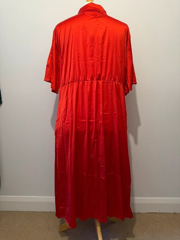 A bold red satin-effect midi dress featuring a flattering wrap-style front, collared neckline, short sleeves, and a flowing full-length skirt. Perfect for any occasion, this dress combines elegance and comfort.