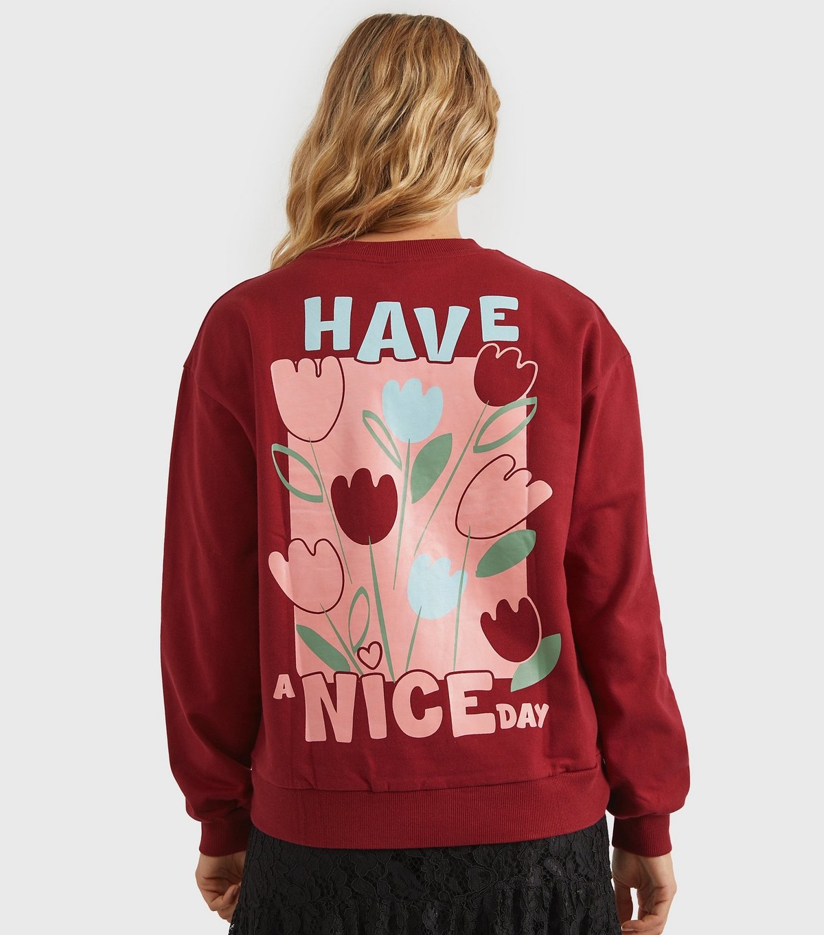 Trendy Burgundy sweatshirt from Custard Clothing featuring a large floral graphic on the back and a sweet 'Have a Nice Day' slogan. Made from soft jersey fabric, it offers a regular fit and is perfect for casual wear.