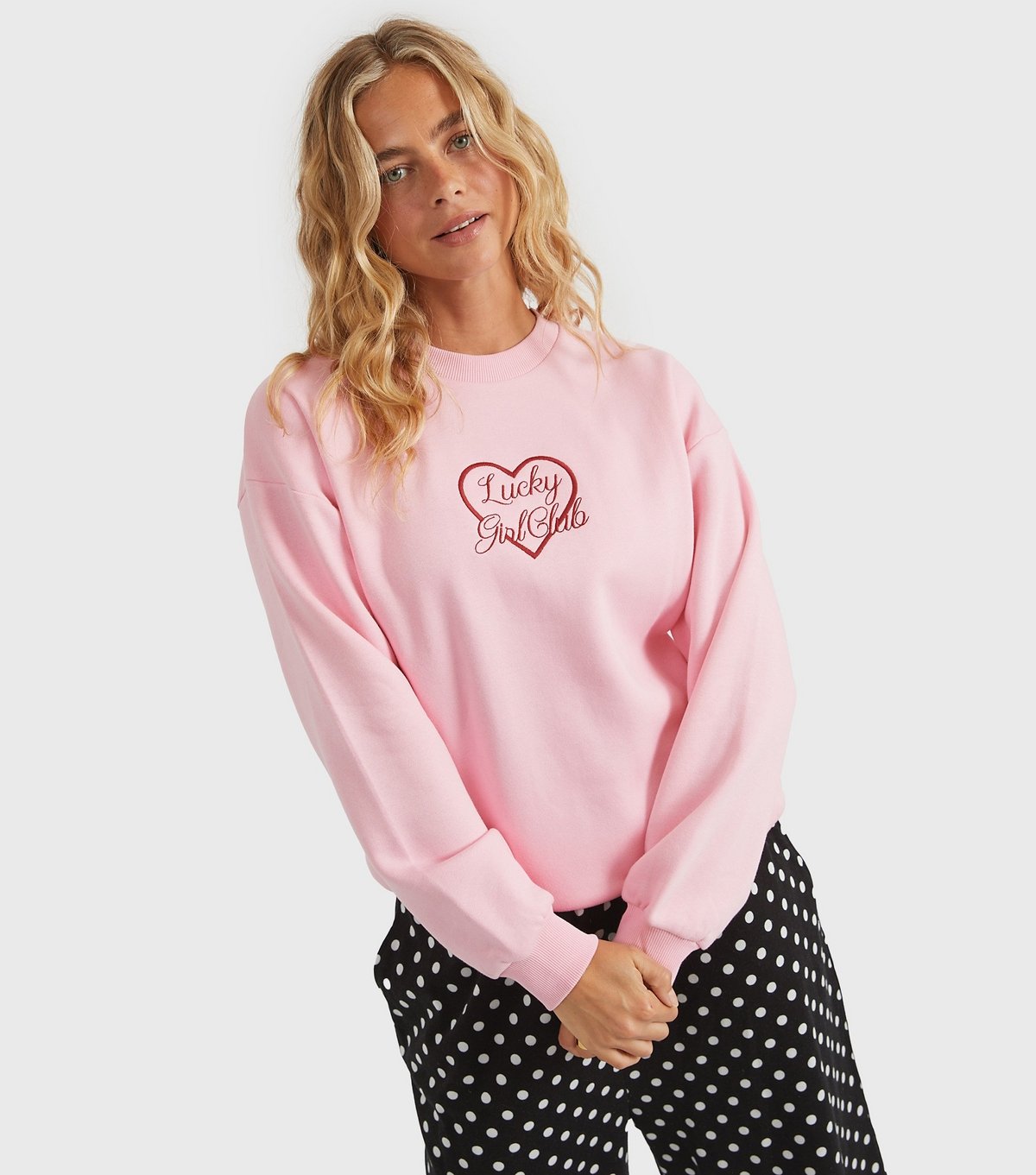 Playful pink sweatshirt from Custard Clothing featuring a cute 'Lucky Girl Club' embroidered logo. Ideal for casual hangouts with friends.