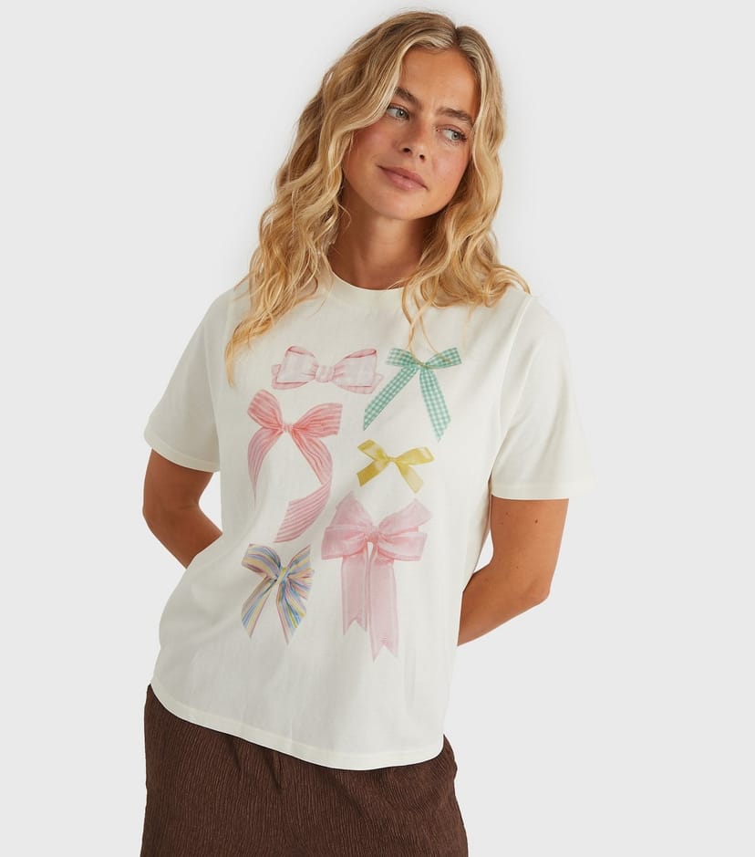 View New Look UK's returns policyPlayful white t-shirt from Custard Clothing featuring a cute bow print. Ideal for a casual look, pair it with jeans or a flowy skirt for a touch of whimsy.