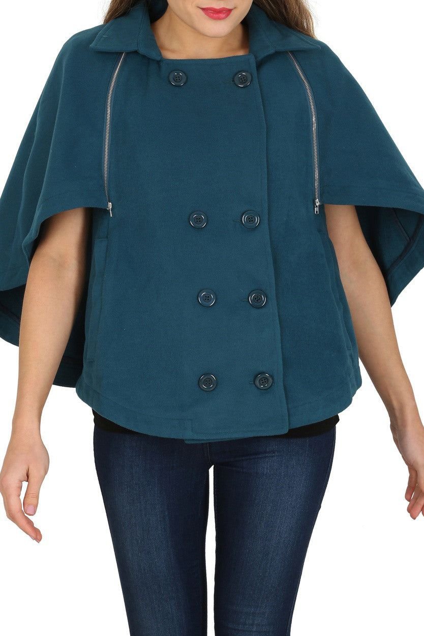 Elegant teal bat wing cape jacket with a structured design and double-breasted button detailing. The zippers at the shoulders add a contemporary touch, making it a versatile piece for autumnal weather.