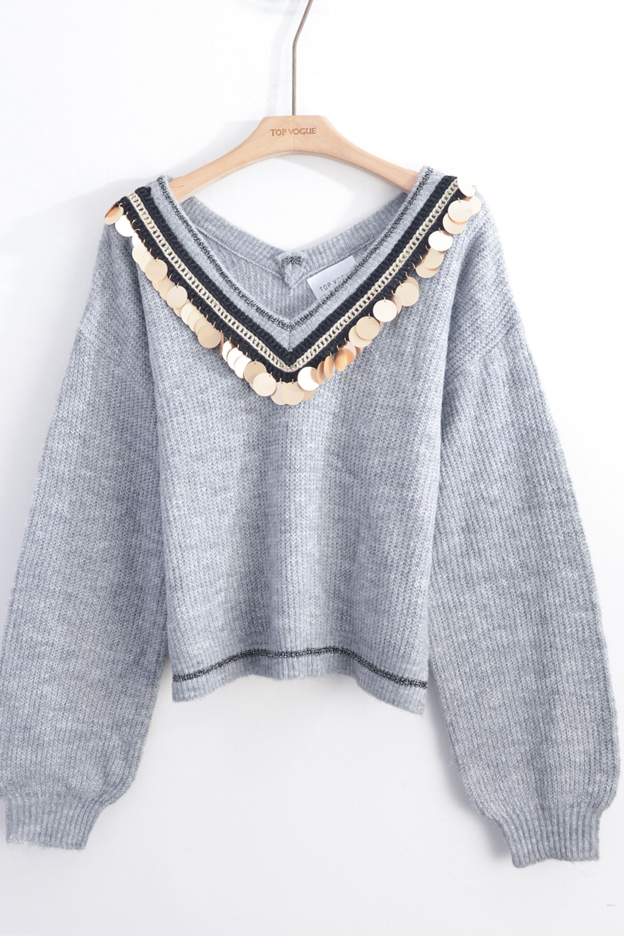 The CY Grey Knit Balloon Sleeve Jumper With Sequin Trim is made from knit, sequins.