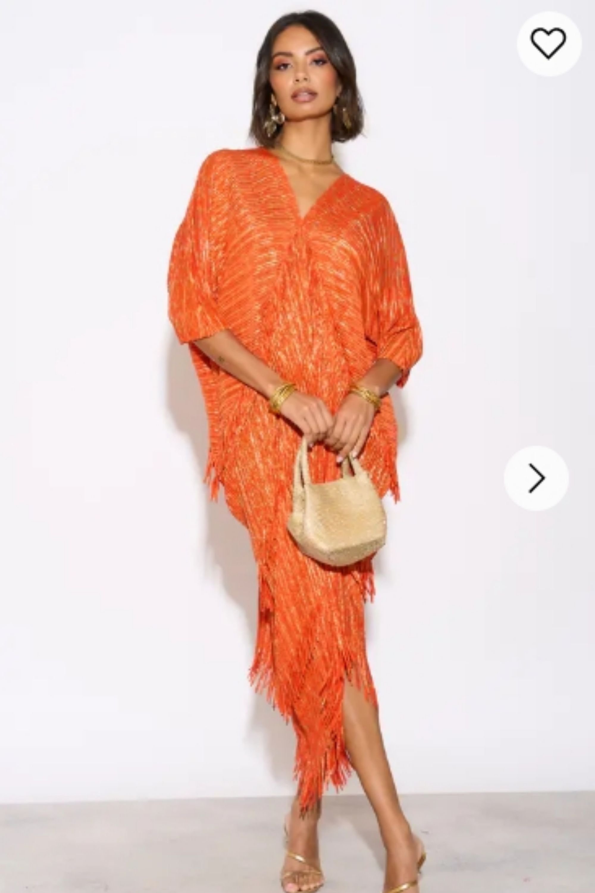 The CY Orange Fringed Tassel Pleated Midi Dress is available in sizes ONE SIZE.
