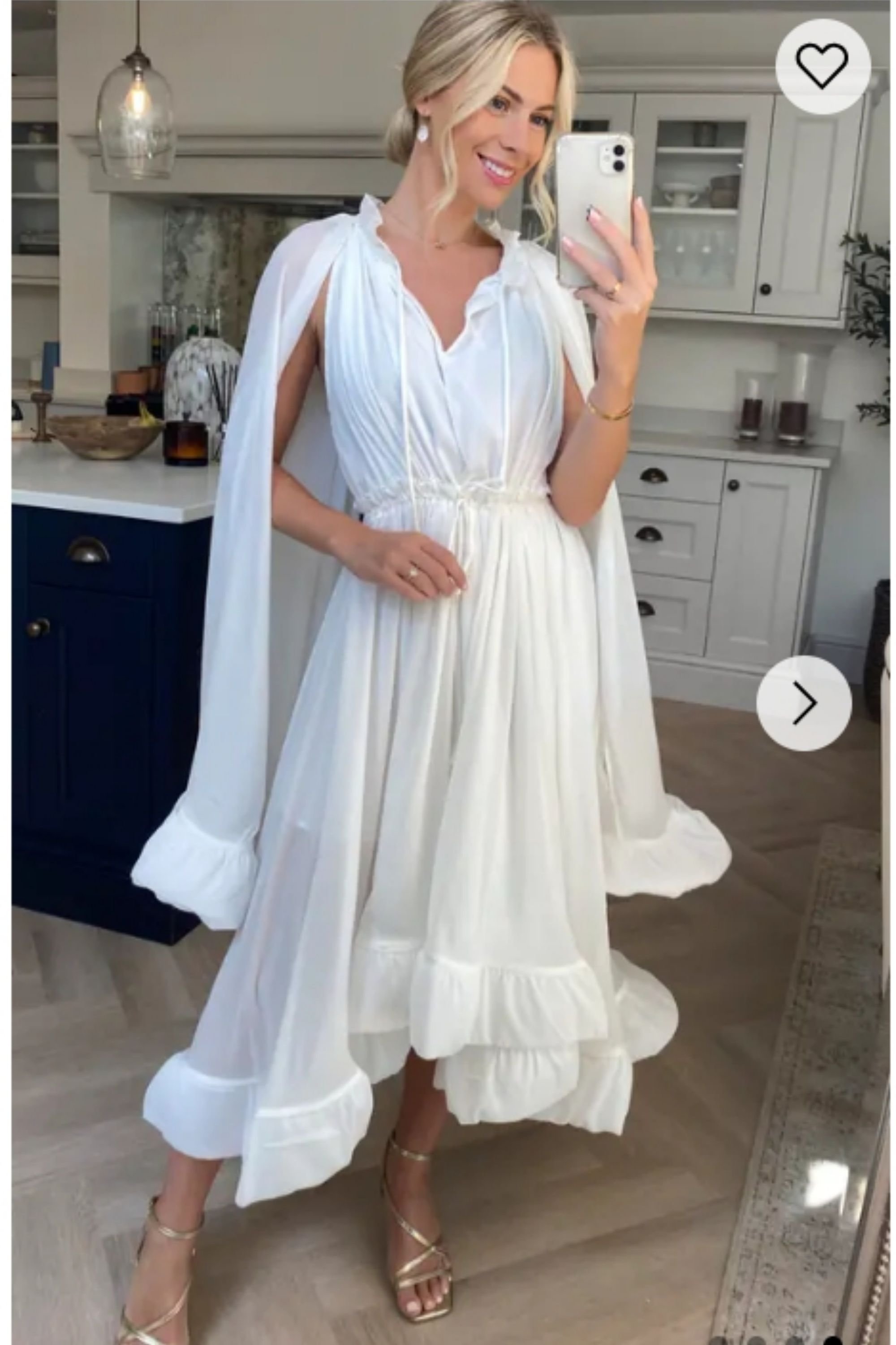 This oversized midi dress in elegant white features dramatic ruffle detailing along the hem and long sleeves. The flowy silhouette is subtly tailored with a tie-up waist, offering adjustable definition.