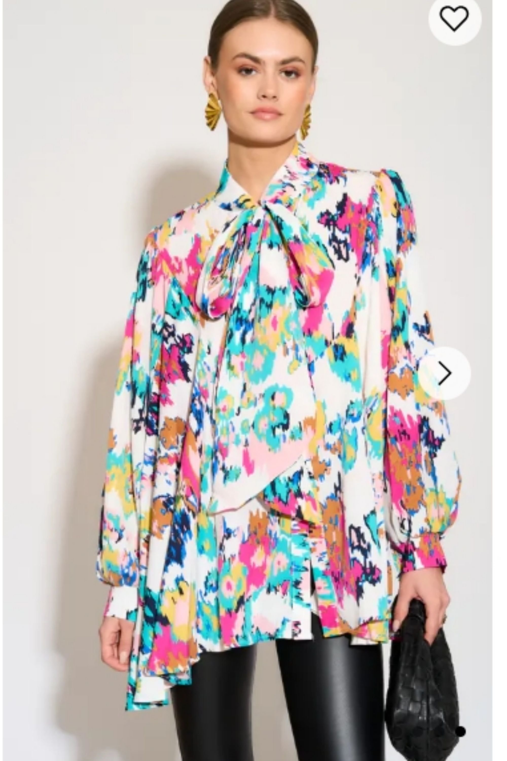 Vibrant multi-color print on a soft, lightweight chiffon shirt. Features a classic collar, relaxed drop shoulders, and a full button-front. The oversized silhouette is balanced by a delicate front tie-up bow. Ideal for casual and evening wear.