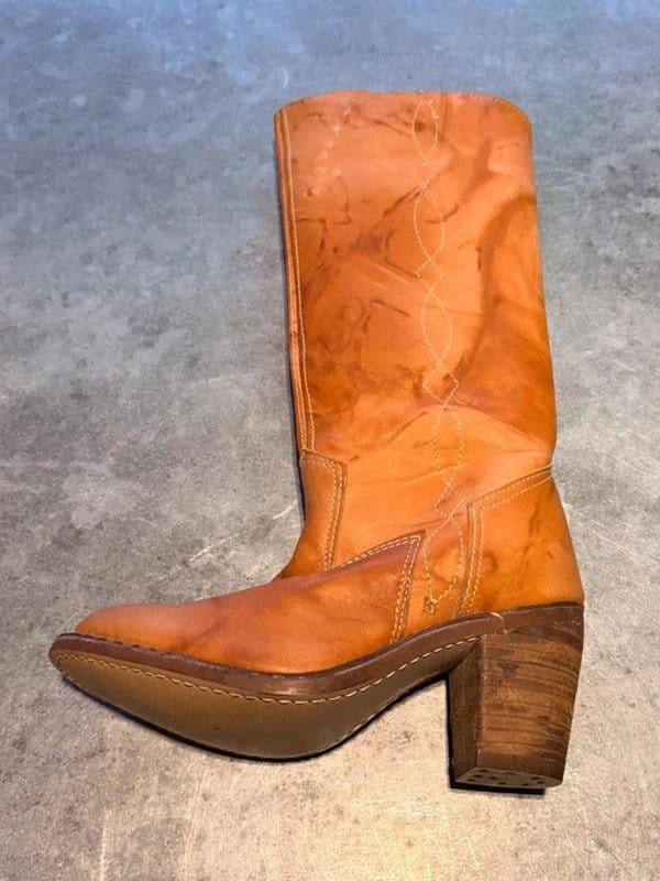 Vintage 1980s Daewoo Leather Cowboy Boots in tan/brown with a 3-inch heel and zip closure. These brand new deadstock boots are a perfect addition to any vintage boot collection.