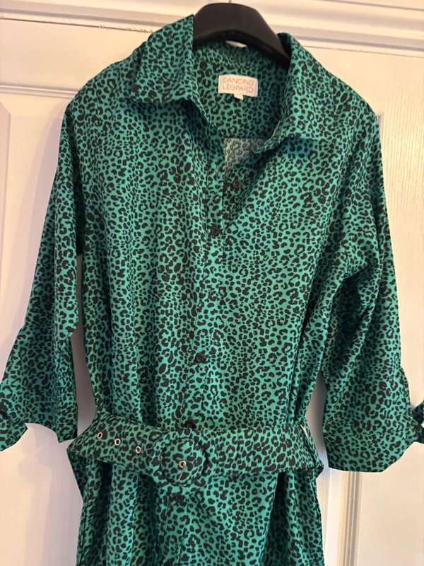 The Dancing Leopard Leopard Print Shirt Dress with Pockets is available in sizes M.