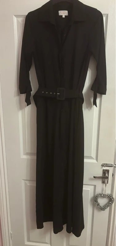 Designed in black, this long-sleeve shirt dress features a belted waist, button-down front and straight skirt. Perfect for versatile styling.