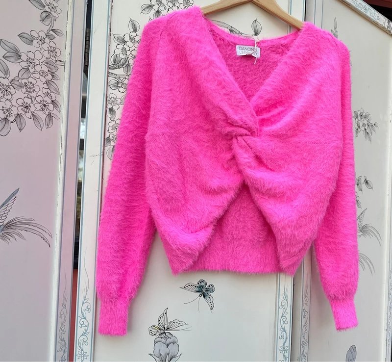 The super popular, sold-out 'Bonnie' jumper from Dancing Leopard is a statement piece in vibrant bubblegum pink. Made from super soft and fluffy knit fabric, this slouchy jumper features a stylish knot at the front and raglan sleeves with fitted cuffs. It offers a relaxed and oversized fit, making it a versatile addition to your wardrobe.