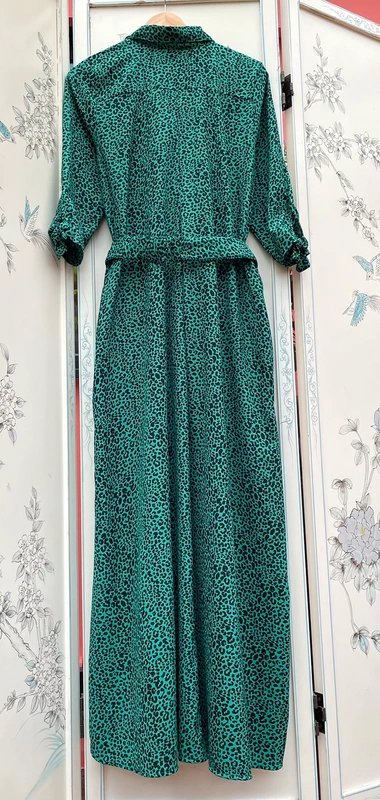 A statement green maxi dress with an all-over black leopard print. Designed with full-length sleeves and buttons down the front, this dress is perfect for any occasion.