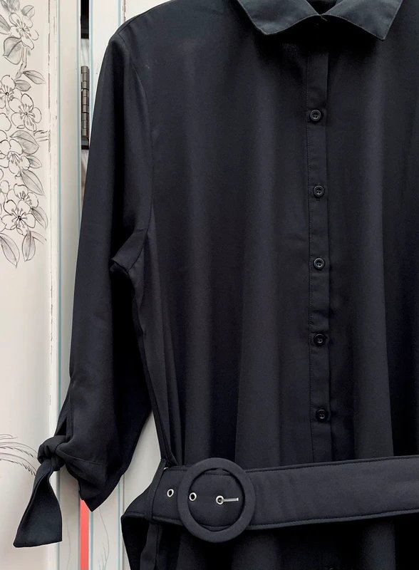This stunning black mini shirt dress by Dancing Leopard is a versatile wardrobe staple. Featuring a button-through front, 3/4 tie sleeves, and a matching belt, it's designed to be effortlessly chic.