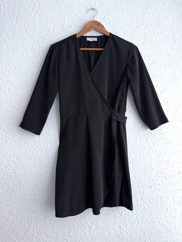 Elegant black wrap dress with a V-neckline and 3/4 sleeves. Features a wrap-around belt at the waist and a knee-length silhouette. Perfect for casual outings or evening events.