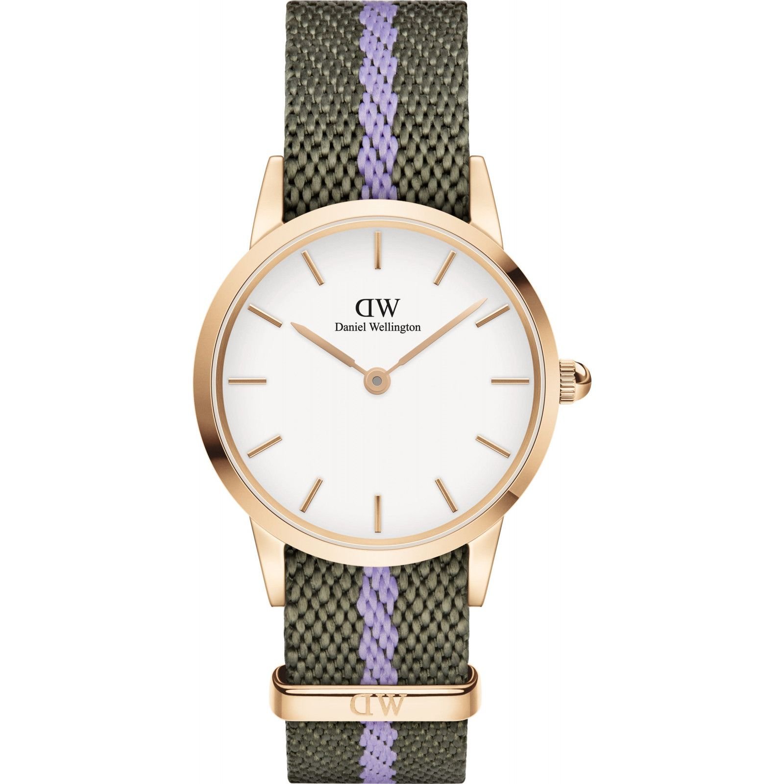 Stylish Daniel Wellington watch for women in green with a rose gold-tone case and a textured fabric strap. Features a classic round dial and elegant minimalist design. Perfect for everyday wear.