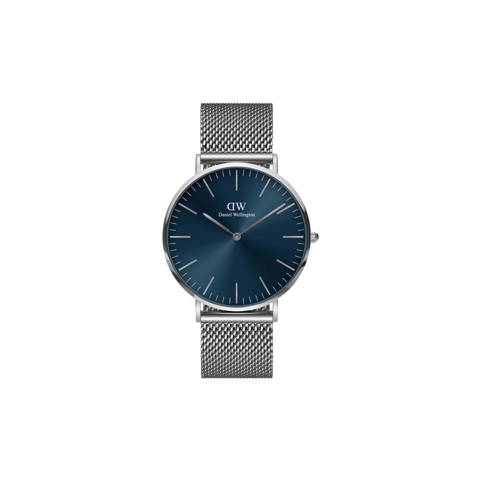 Sleek Daniel Wellington men's watch with a 40mm silver dial and a mesh silver bracelet. Crafted with precision, it features a quartz movement and comes in original packaging.