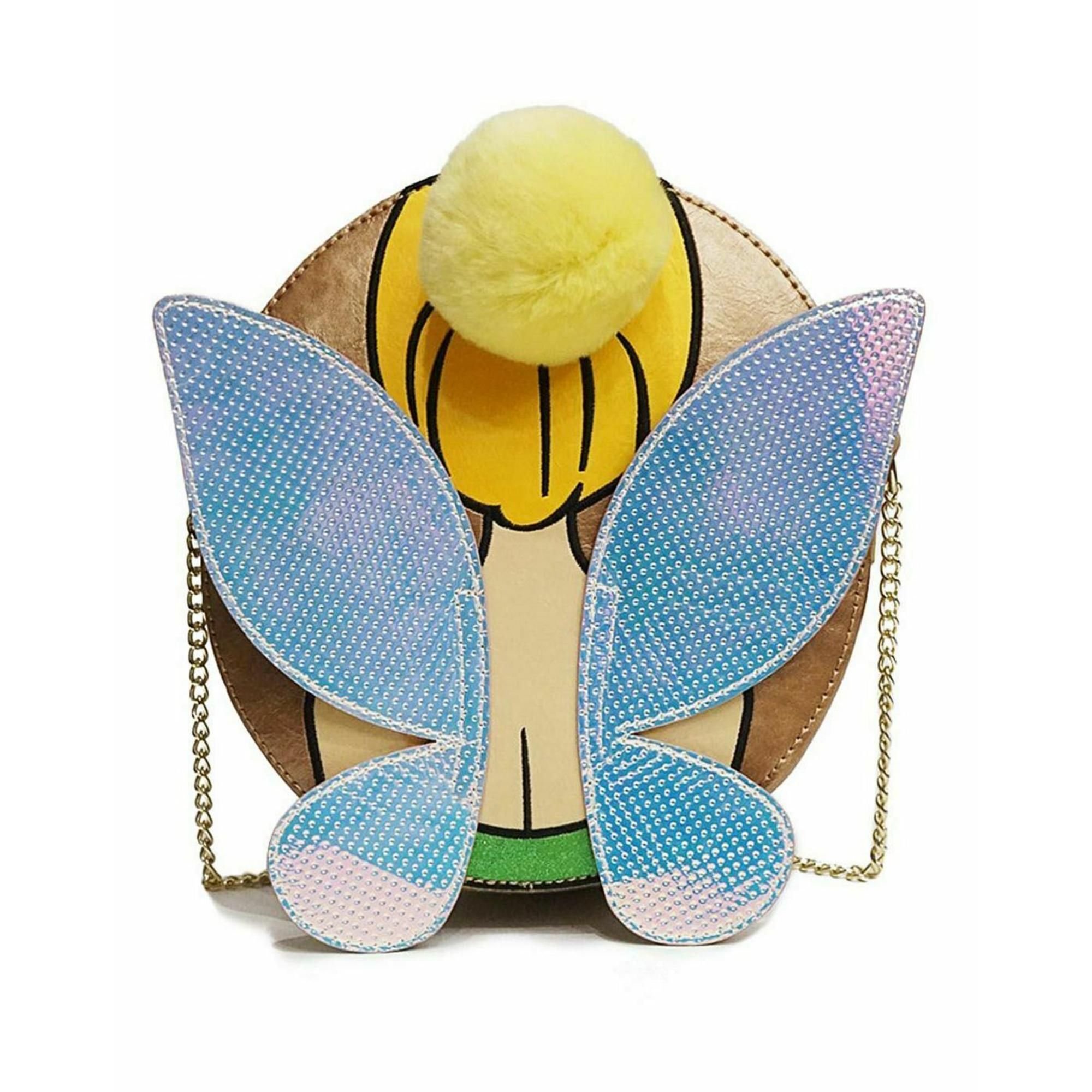 Charming Disney Peter Pan Tinker Bell crossbody bag by Danielle Nicole. Featuring a 3D design of Tinker Bell peering through a keyhole, with shimmering wings and a fluffy pom-pom. Ideal for adding a touch of magic to any outfit.