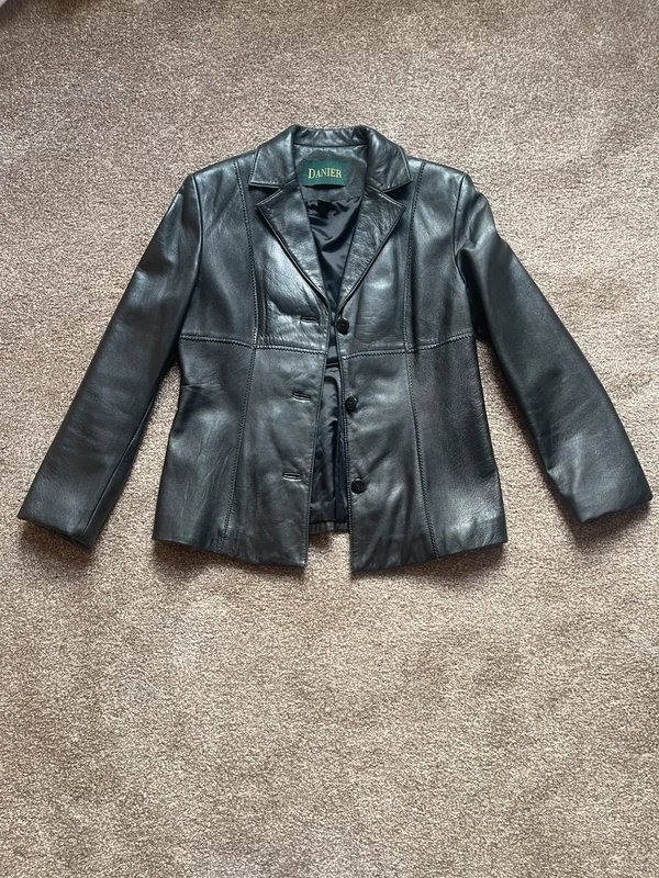 The Danier Black Leather Tailored Jacket is available in sizes M.