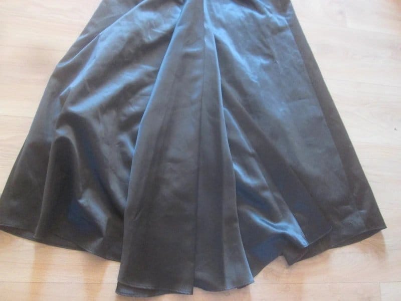 This Debenhams black satin evening gown is a size 10 with a small fitting. The chest measures 35 inches and has boning. It measures 55 inches from the top to the bottom. Made from 100% polyester with a nylon mix underskirt.