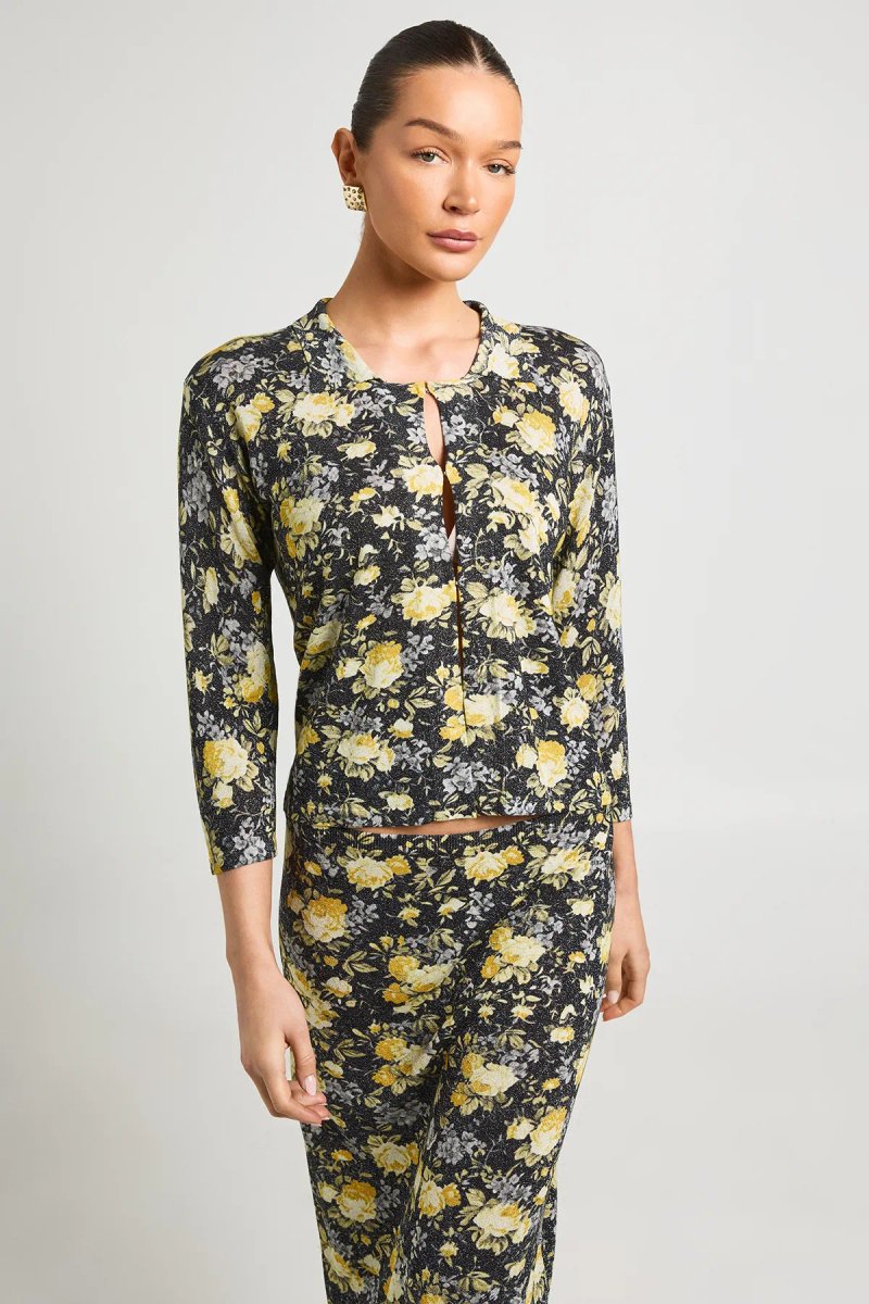 Multicolor Floral Print Crew Neck Short Sleeves Cardigan — the perfect addition to your spring wardrobe. Designed in a pop colour vintage floral print, this crew neck cardigan features short sleeves with ribbed collar detail and a button-through front fastening. Crafted from lightweight metallic shimmer yarn & soft-touch knitted jersey fabric, it is inspired by vintage British style. Ideal for casual spring outings.