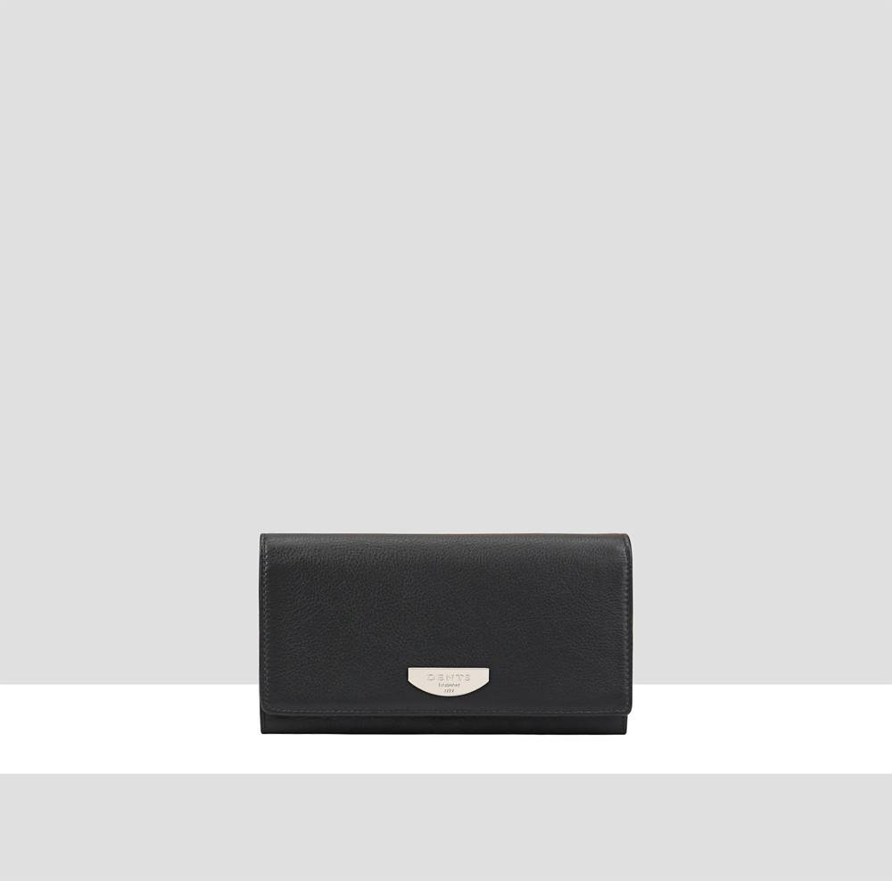 Sophisticated black leather purse with ample storage. Features extensive card space, divided note compartments, an ID window, and a secure zip pocket for coins and small valuables. A timeless everyday wallet that balances style with functionality.