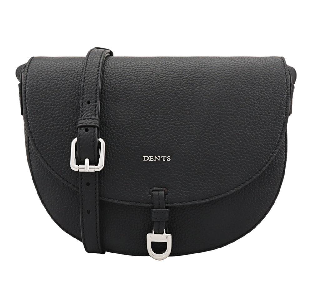 Stylish black leather crossbody bag from Dents. Features a magnetic closure, metal brand logo pin, and a convenient zipped pocket on the back. Designed for hands-free convenience.
