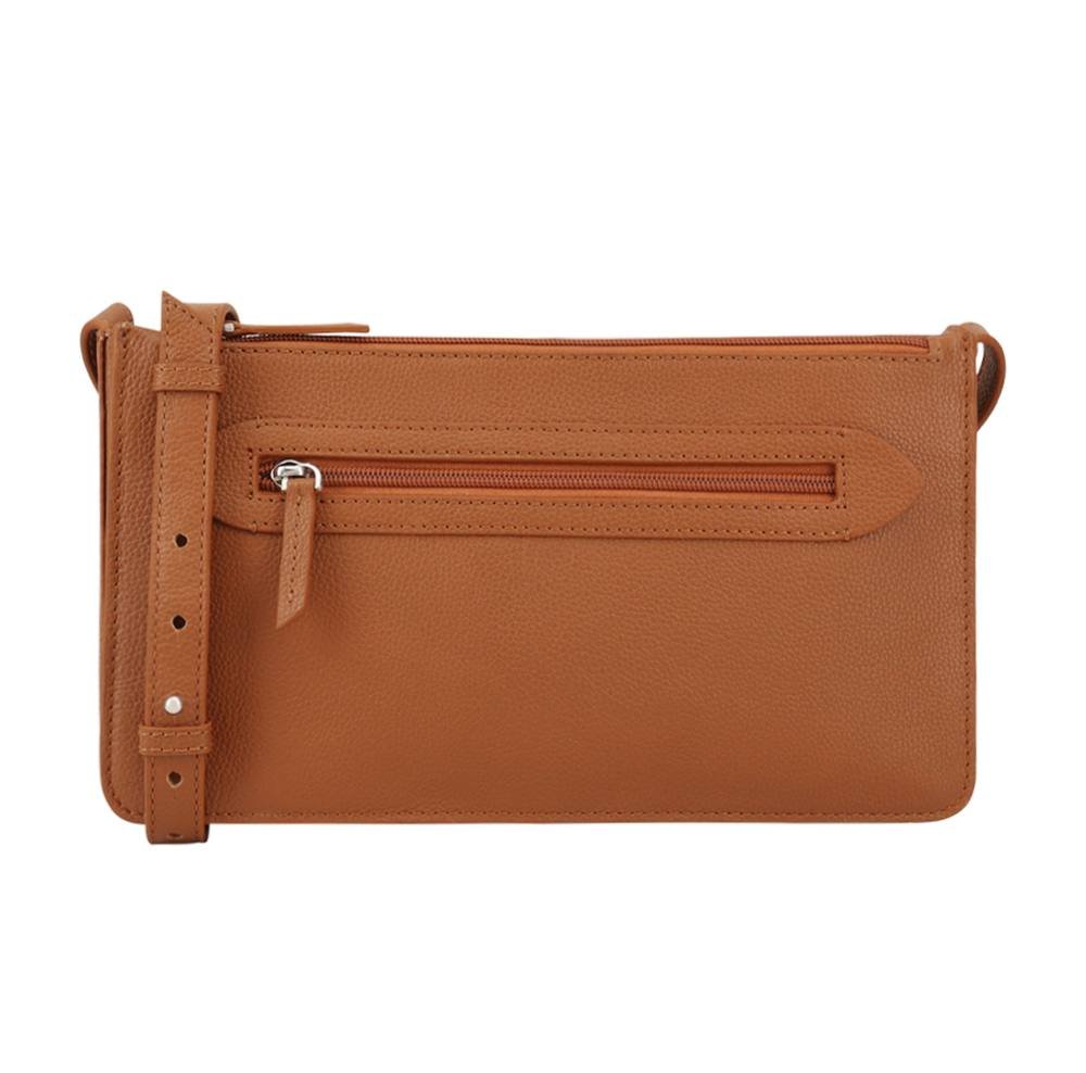 Sleek crossbody bag crafted from soft leather with a brown finish. Features three zipped compartments and a front zipped pocket for organized storage. The adjustable shoulder strap ensures comfort and convenience.
