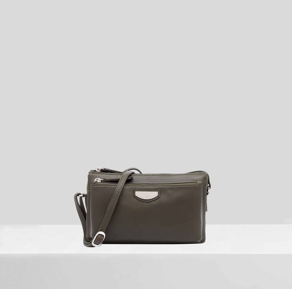 Sleek olive leather crossbody bag with a contemporary design. Features a trio of zipped compartments for neat organisation. Crafted from soft, quality leather with sleek hardware.