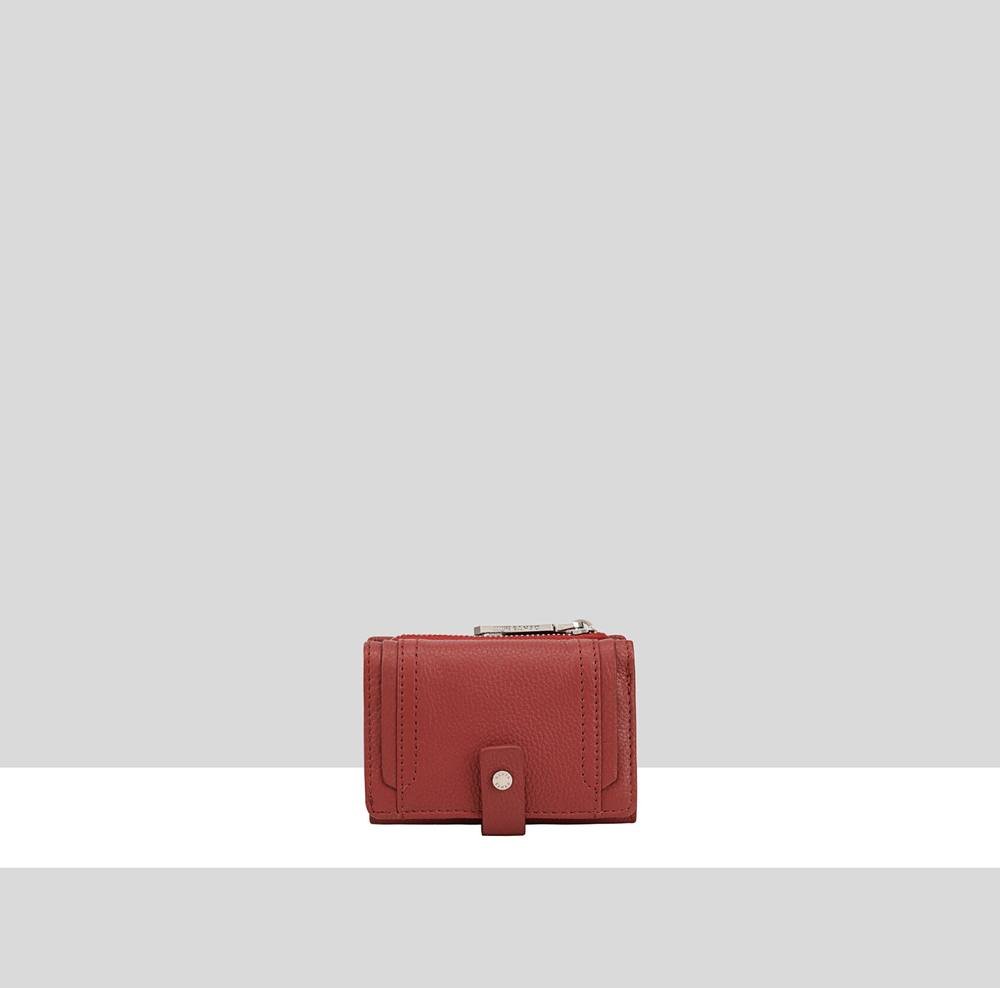 Compact red leather wallet with multiple card slots, a central zipper compartment, and a coin pocket. Features a secure snap closure and silver hardware.