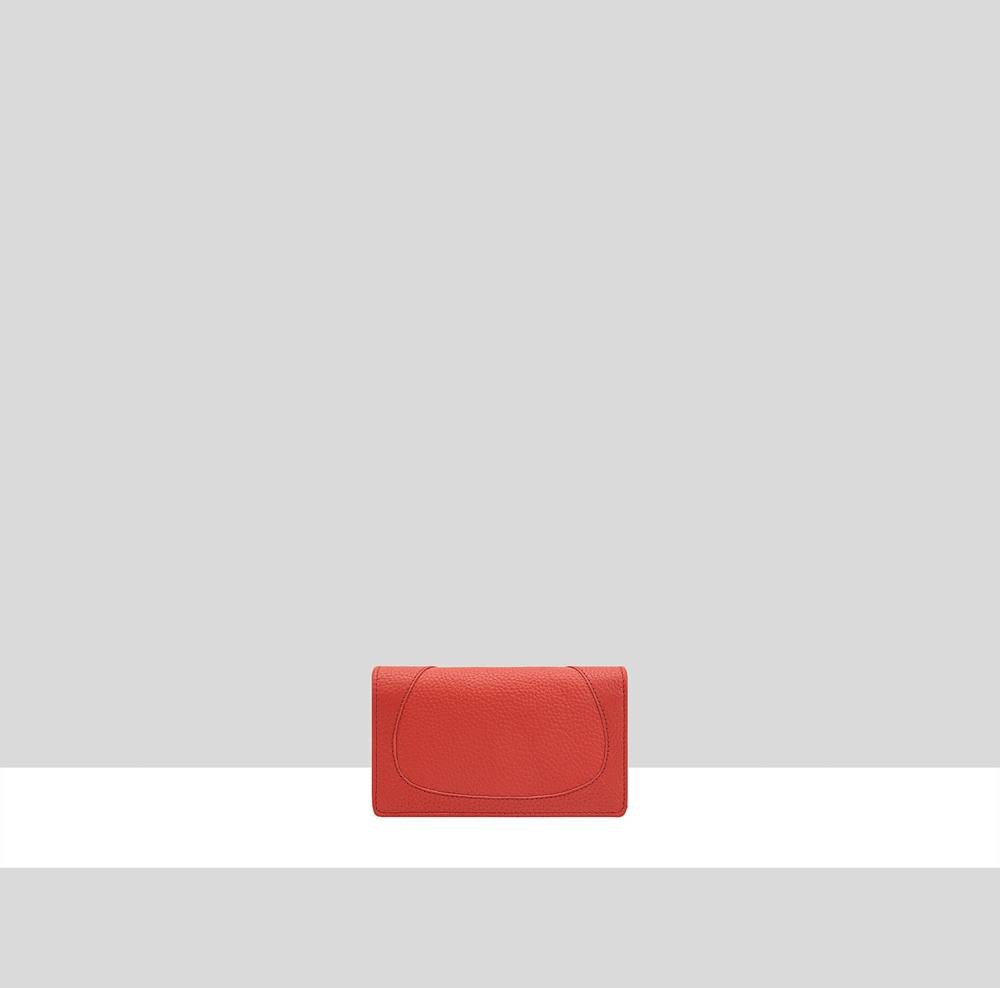 Sleek and stylish red leather purse with a flap-over closure. Features multiple compartments, including two zipped sections for coins and essentials. Perfect for everyday use.