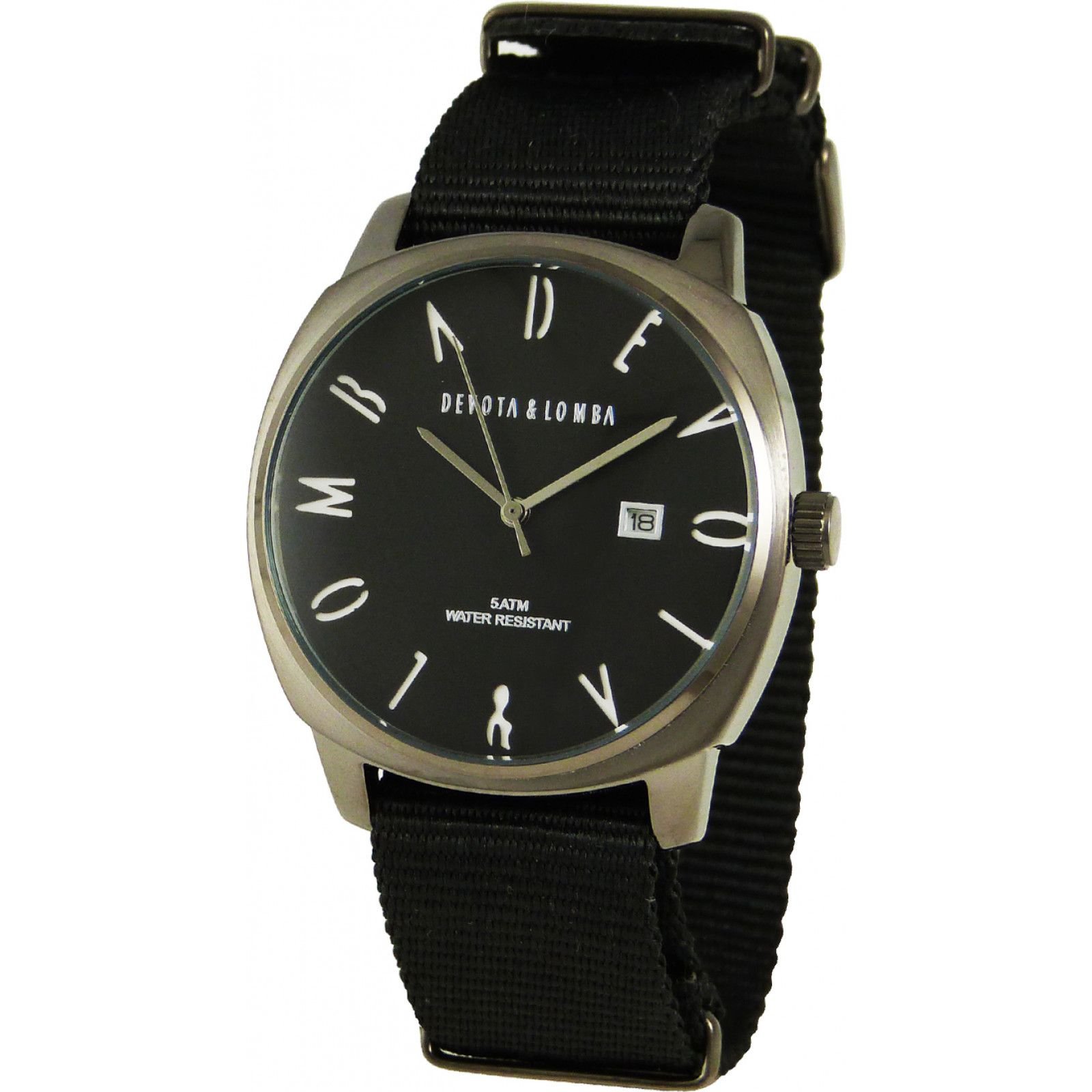 A Devota & Lomba men's watch with a black dial and black nylon strap. Features a water-resistant design and quartz movement. Ideal for everyday wear.
