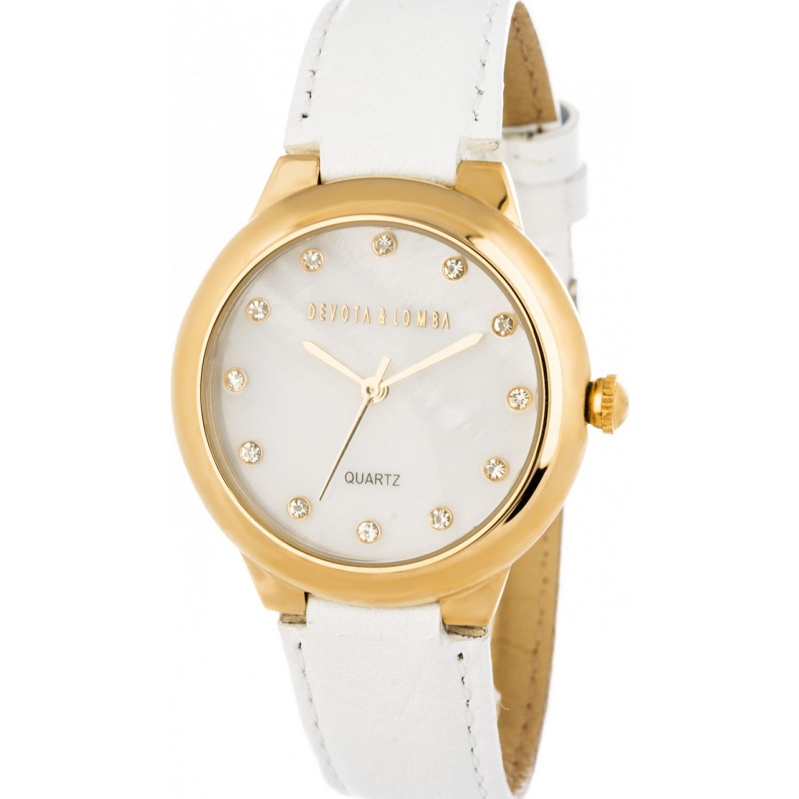Elegant white quartz watch from Devota & Lomba, featuring a gold-tone case, crystal accents, and a leather strap. A sophisticated accessory for any occasion.