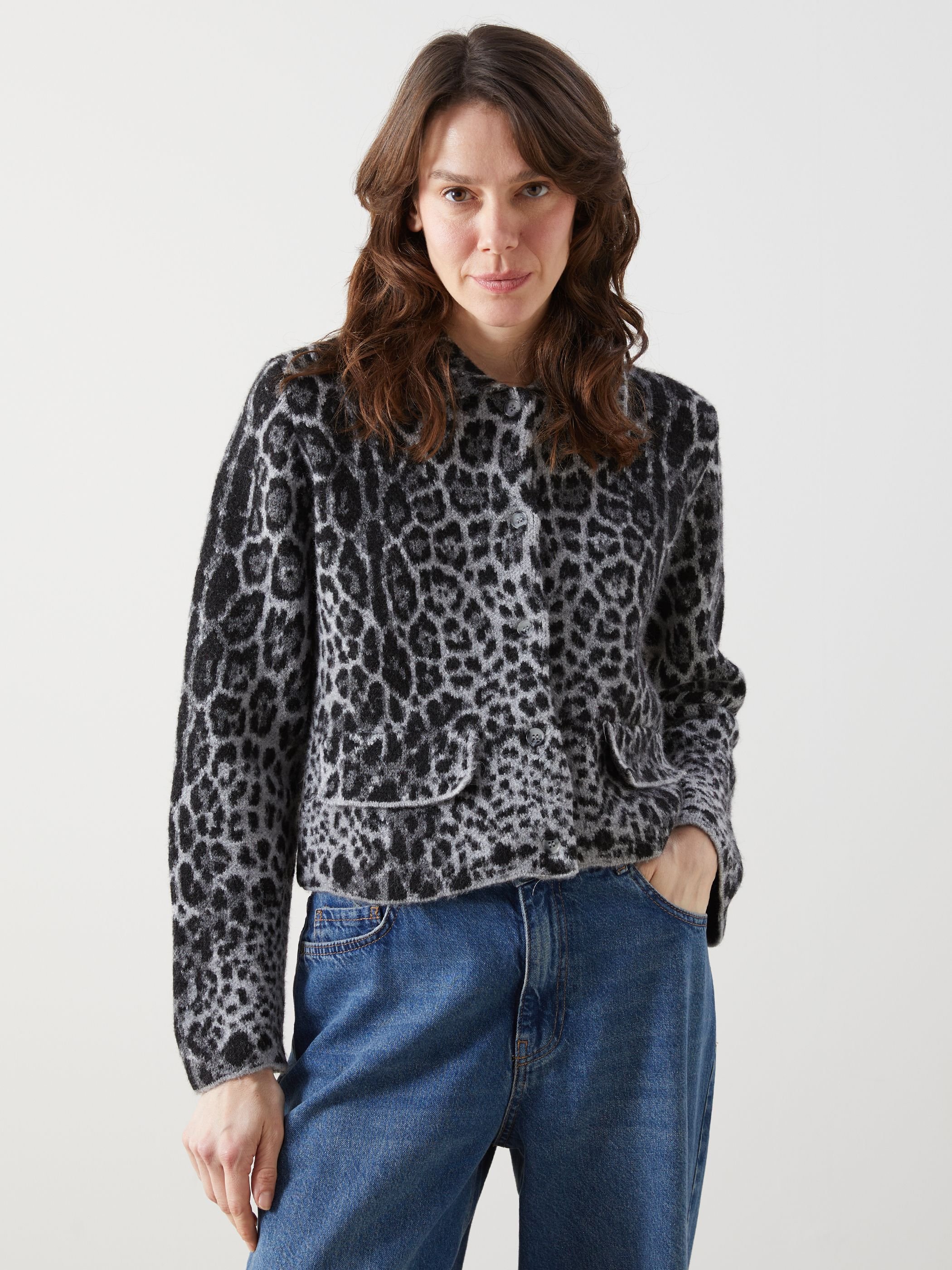 Chic and versatile leopard print cardigan in black. Crafted from a blend of Acrylic, Polyester, and Polyamide, it offers a soft, lightweight, and cozy feel. The timeless leopard print adds a touch of wild elegance.