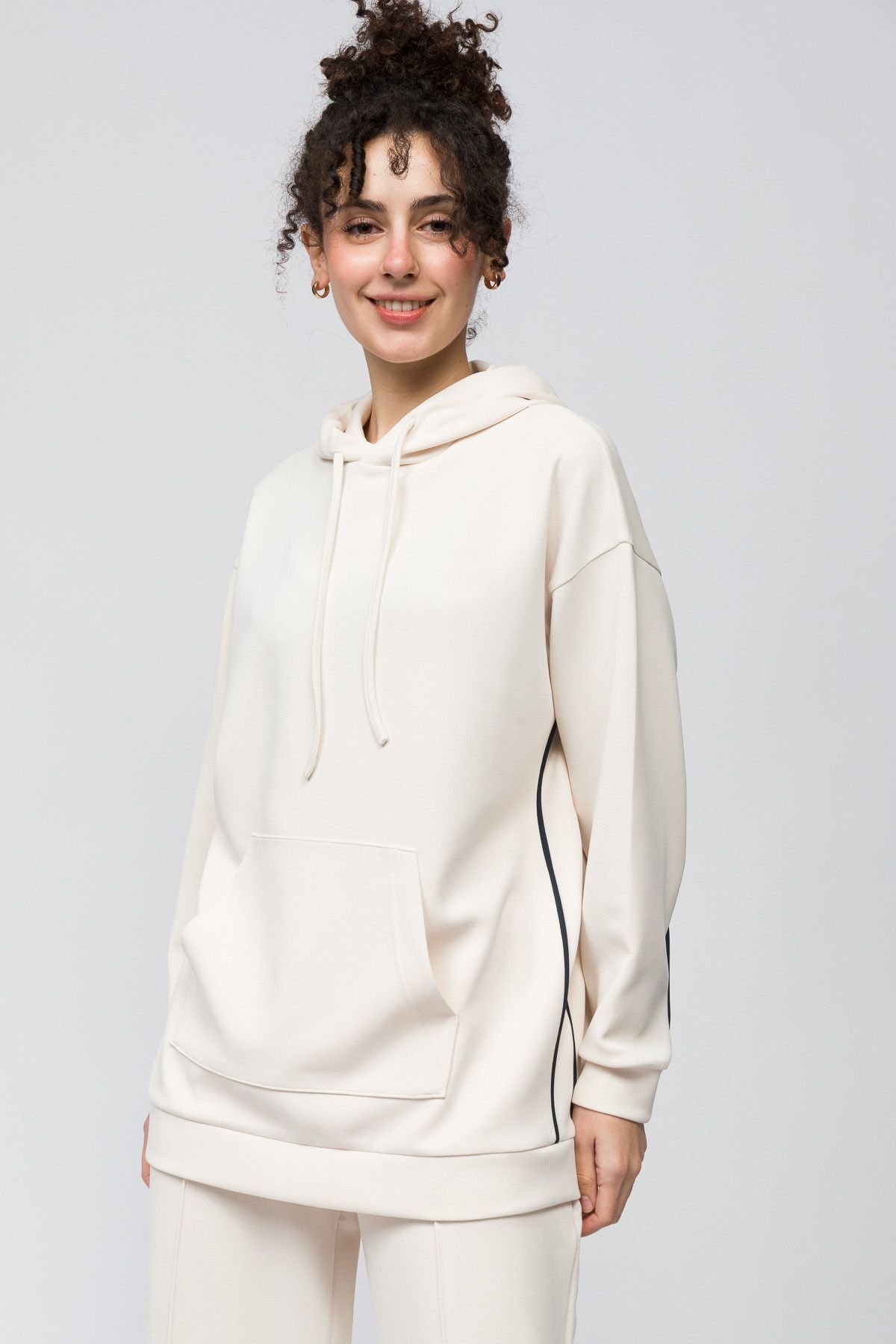 Elegant ecru hooded sweatshirt crafted from a soft and stretchy modal blend. Features contrast piping along the seams, a spacious hood, and a practical front pocket for a relaxed yet refined silhouette.