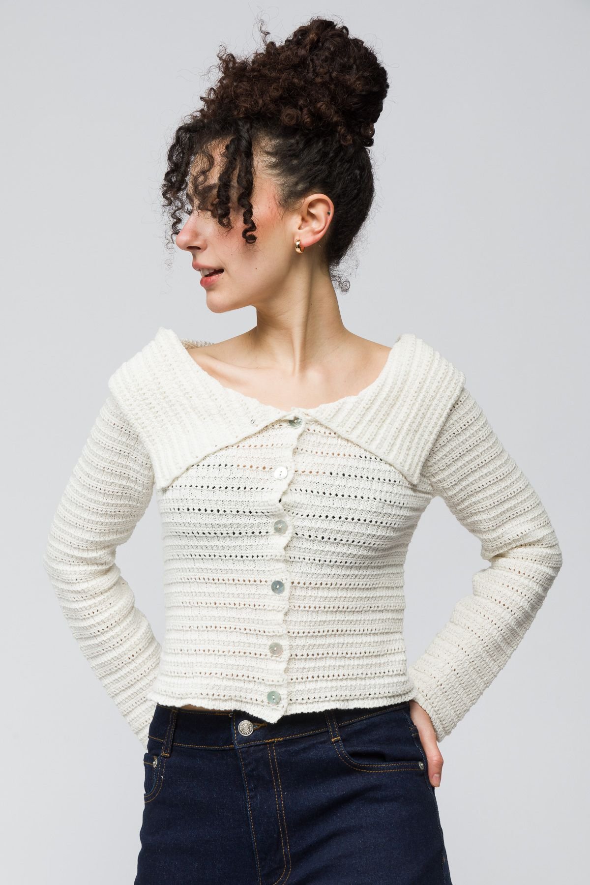 The Dexia Ecru Cotton/Polyester Knitted Cardigan with Button Detail is ideal for casual, semi-formal.
