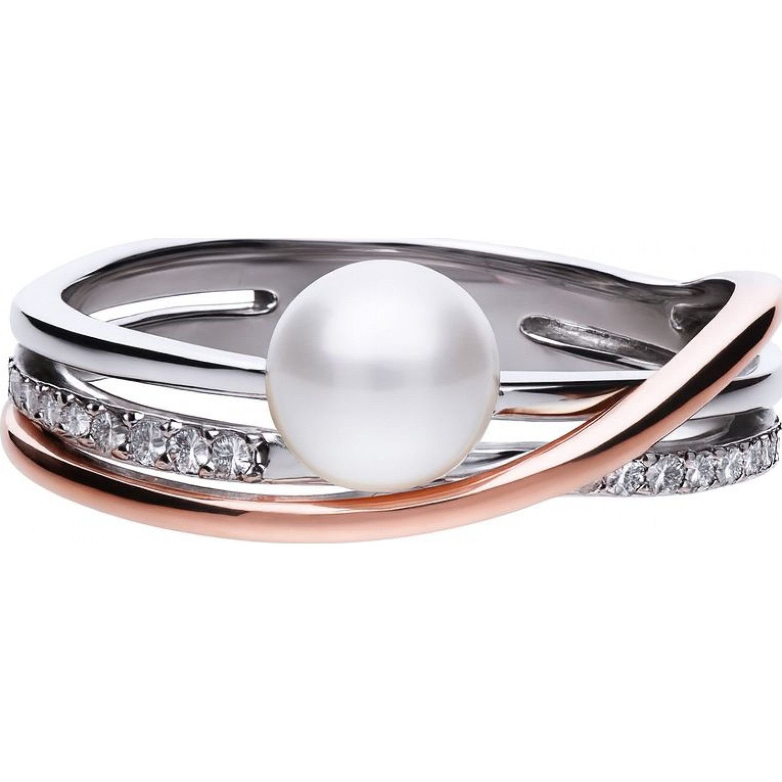 Elegant multicolor ring from Diamonfire, featuring a central pearl surrounded by silver and rose gold bands adorned with diamonds. Perfect for adding a touch of luxury to any outfit.