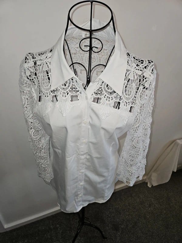 Elegant white lace blouse with intricate crochet detailing on the shoulders, sleeves, and back. A unique and stylish addition to any wardrobe, perfect for smart occasions.