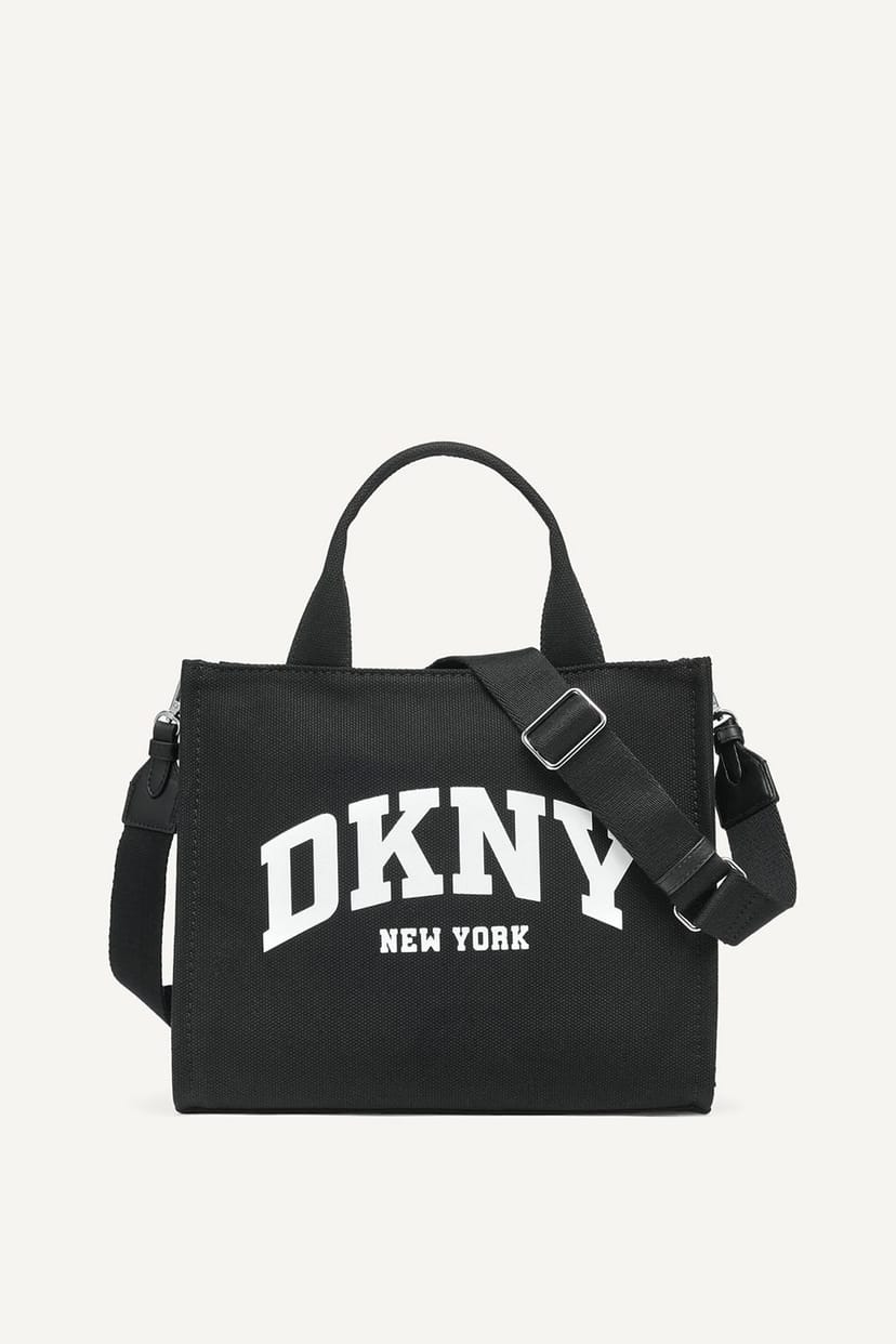 Stylish DKNY medium tote in black canvas with a bold logo. Features both top handles and an adjustable shoulder strap for versatile carrying options. Ideal for everyday essentials.