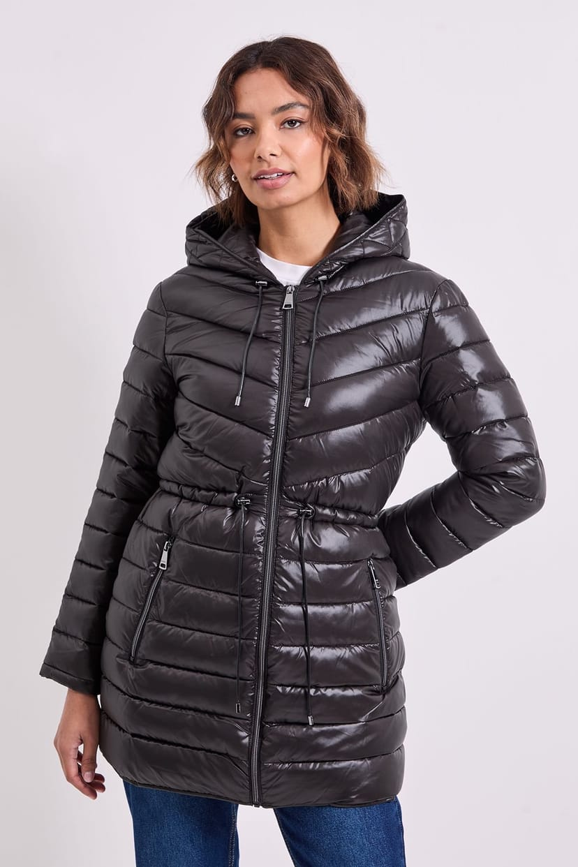 Sleek DKNY puffer jacket in black with a chevron quilting pattern. Features an adjustable waist with a drawstring toggle for a customised fit. Includes a full-length front zip with branded DKNY hardware and a cosy hood with a drawstring for added warmth.