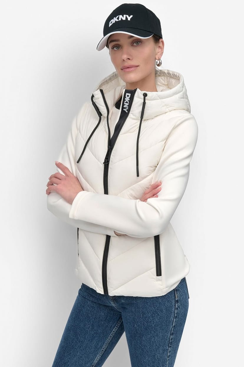 Stylish DKNY quilted jacket in cream with a mix media design. Features a padded hood, zipper closure, and side pockets. Ideal for layering over casual outfits.