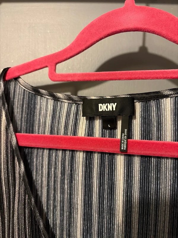 The DKNY Black and Cream Striped Jumpsuit is available in sizes L.
