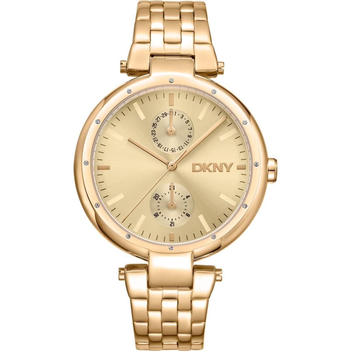 Elegant gold quartz watch from DKNY, featuring a champagne dial and gold-tone metal bracelet. Designed for durability and timeless style.