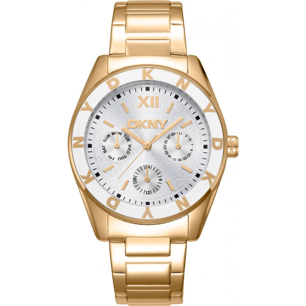 Elegant gold quartz watch from DKNY, featuring a white dial with gold accents and a sleek gold-tone metal band. Designed for durability and style, perfect for everyday wear.