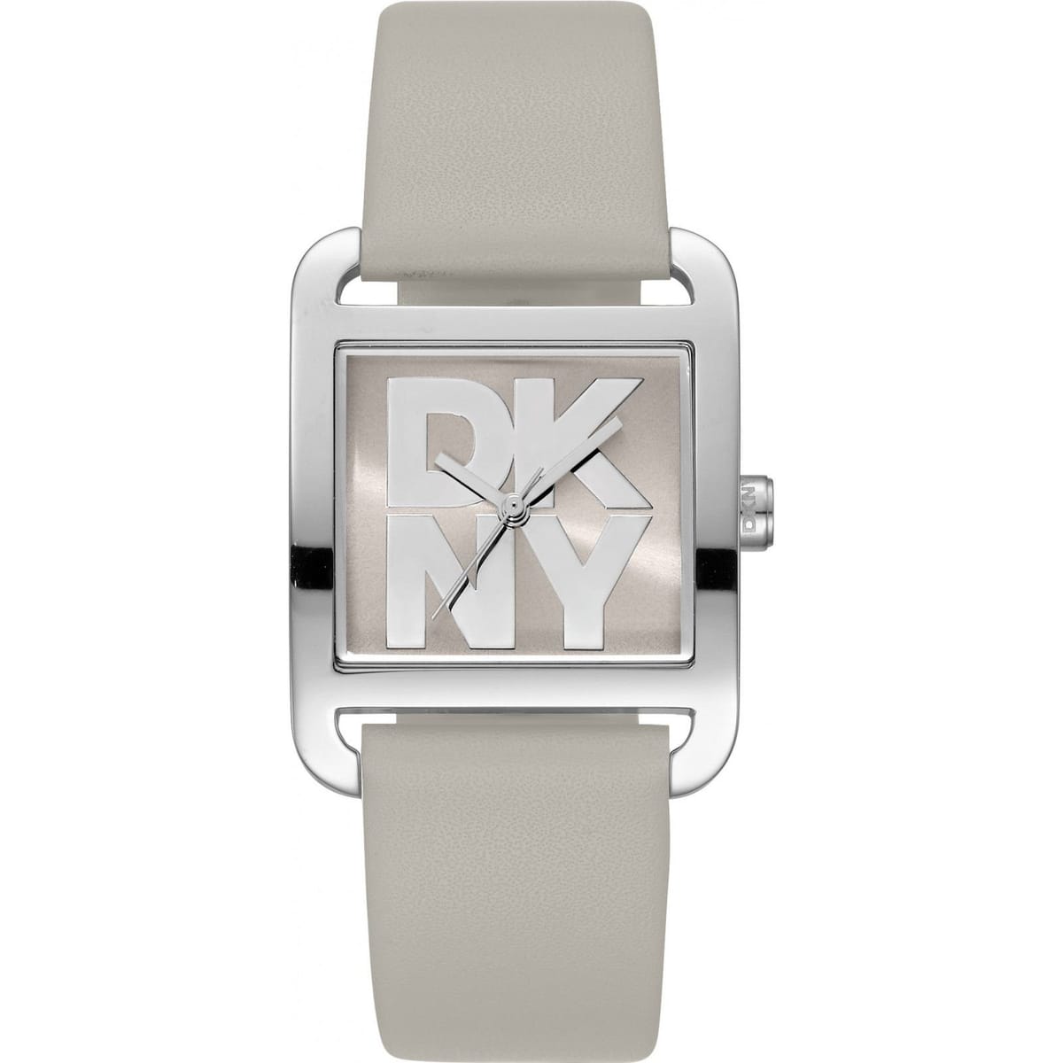 Stylish DKNY watch with a light grey dial and silver-tone accents. Features a square face and DKNY branding on the dial. Ideal for everyday wear.