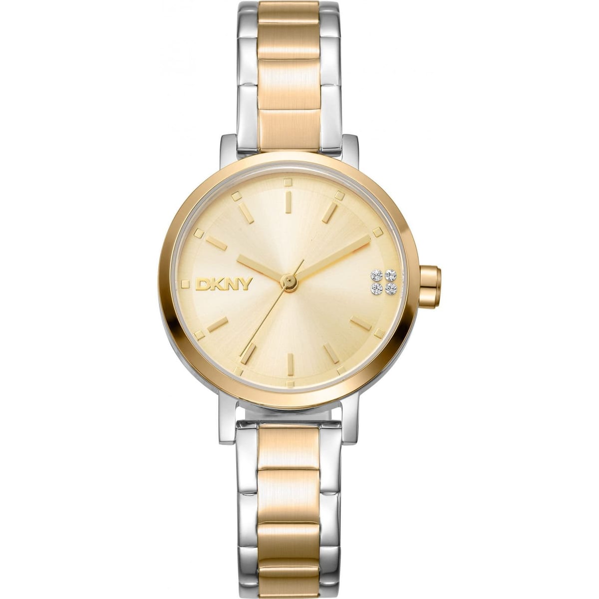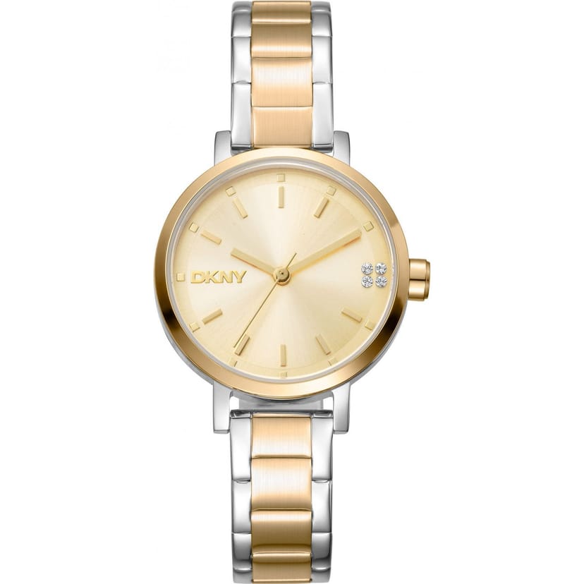 Elegant DKNY Soho 30mm Quartz Watch with a gold-tone dial and silver-tone bracelet. Features crystal accents and a sleek design for a touch of glamour.
