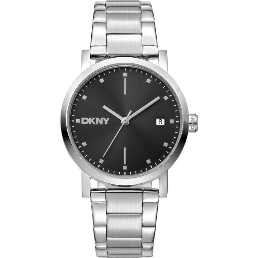 Sleek DKNY watch with a 34mm silver case and black dial. Features silver hands and index markers for easy readability. Perfect for everyday wear.