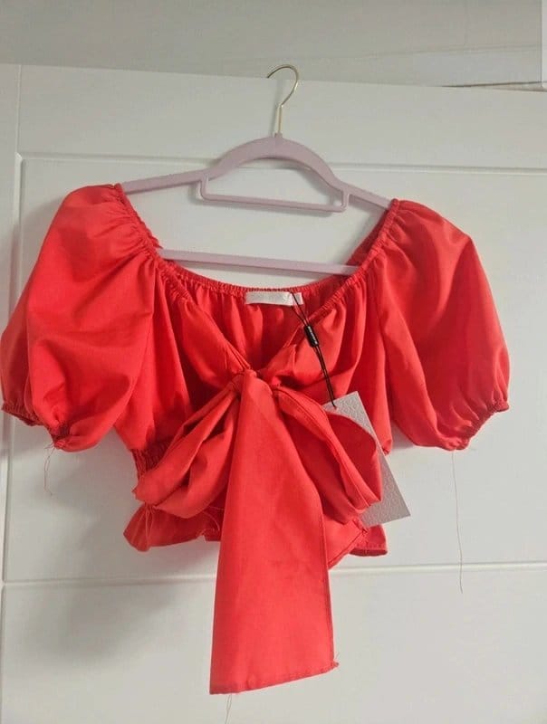 See all outfit ideasVibrant red crop top with short puff sleeves and a playful bow-knot detail. Made from smooth, shiny fabric, perfect for a day or night out.